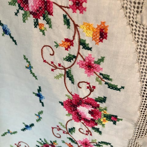 Vakker liten brodert bomullsduk med flott heklet rosett. Hel og pen. Kan sendes med Posten for kr 58,-.