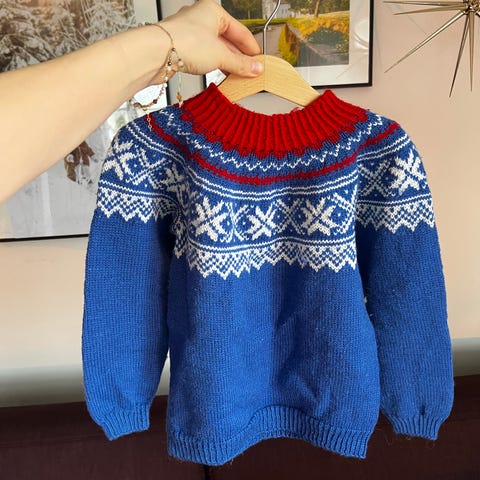 Marius genser i ull for barn, størrelse 104. Genseren er flerfarget med tradisjonelt mønster, egnet for både gutter og jenter. Laget av ull som gir varme og komfort. Den klør ikke!