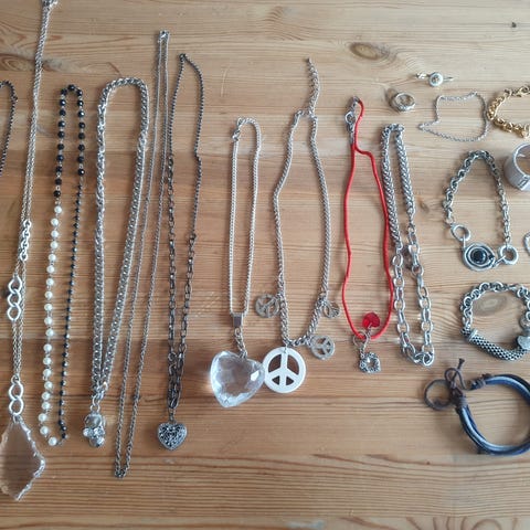 Selger en pakke med mye smykker, blant annet ringer, armbånd og øredobber. Mulig noe sølv. To klokker, men disse går ikke, vet ikke om de kan fikses.