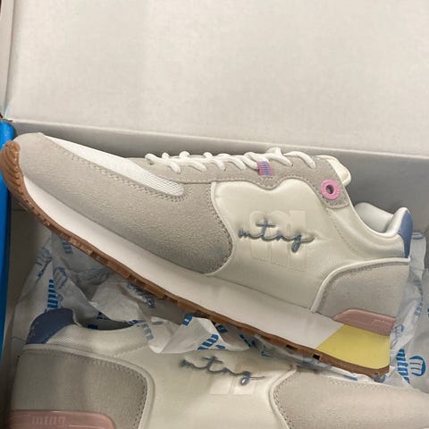 Skoene er svært pent brukt. Ble dessverre noe misfarget bak på hælkappe og litt på det hvite på sålen da jeg vasket dem pga klargjøring for salg (se bilder). Dette er ikke veldig synlig når skoen er på.