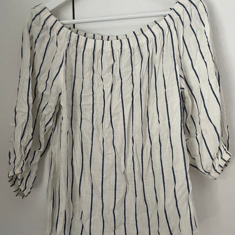 Rosa/hvitstripet bomullsbluse med trumpet-ish, utsvingte armer og elastisk/strikk utringning. Boxy fit. 100% bomull.