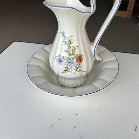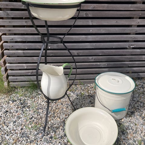 Består av vaskefat og mugge ,såpekopp uten underdel og lokk til skrin hvor desverre underdelen har blitt borte.