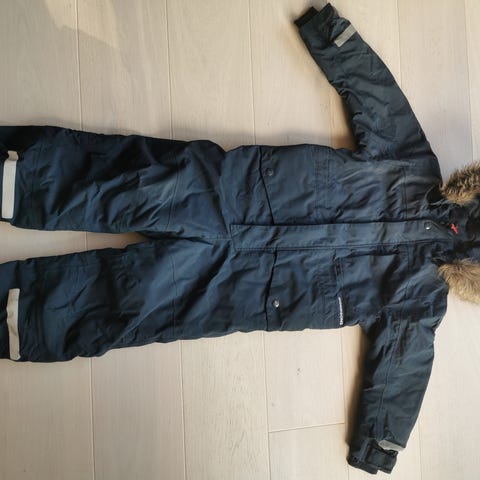 Godt brukt vinterdress med mye bruk igjen. 100 % vanntett. Sydd igjen hull i rompa, bør ha en lapp over seg. Begge strikker i bena intakte, men stoffet rundt den ene kan sys. Reflekser på bakbenet har løsnet litt. Se ellers bilder.