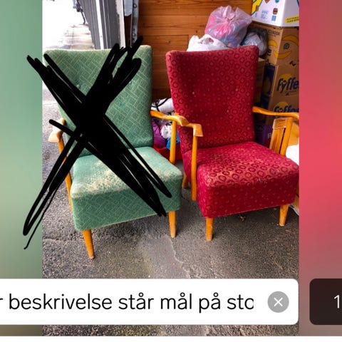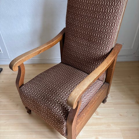 Denne stolen kan «rockes» opp med nytt trekk og maling! Stolen står på torpet vårt i Värmland. Vi bor i Moss, og kan levere på strekningen mellom Østervallskog i Sverige, via Ørje og til Moss.