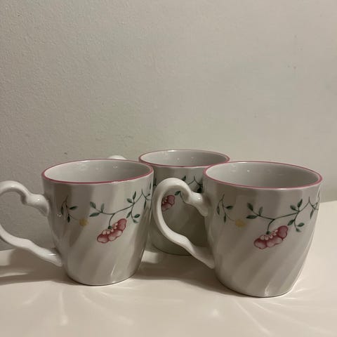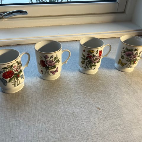 Fire Lenox krus H: 11 cm D: 9 cm med tre forskjellige motiv. Et Eastern Taiked Blu, et Dragonfly og To Fritillary motiv. Alle i fin stand uten skader, med friske farger og blank glasur. Kr. 150,- pr. stk.