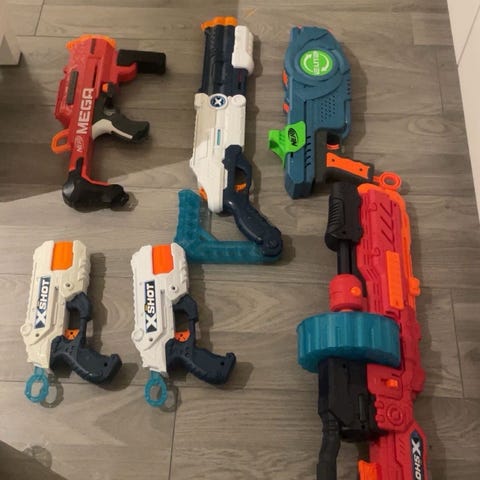 Selger lekepistoler med myke patroner. Prisen er 150,- pr stk for de store og 70,- for de små.