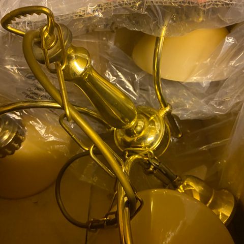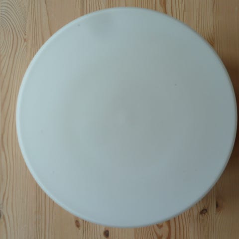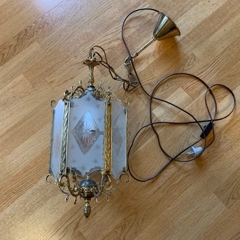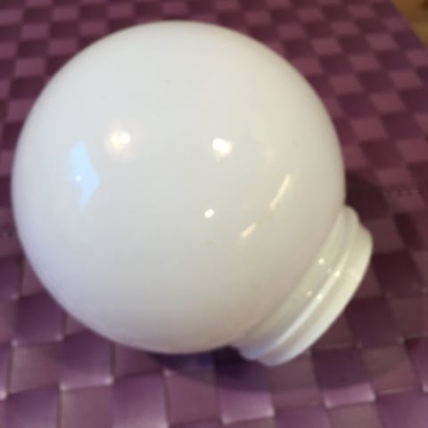 Hel og fin, ingen riper. Diameter åpning nederst ca 19,5 cm, diameter midten ca 29 cm, høyde til toppen av metalldingsen på selve kuppelen ca 46 cm.