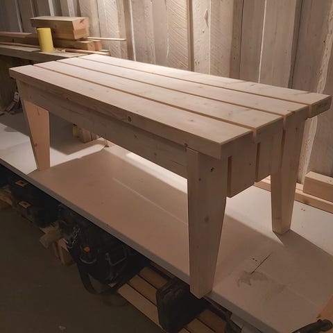 Grei å slå sammen, så tar lite plass ved lagring. Solid benk. Denne er laget på 1970 tallet. Benken er 138cm bred.