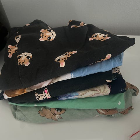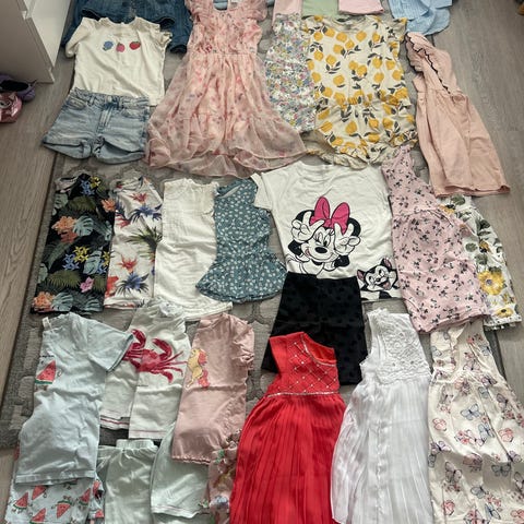 Klespakke til jente i str 110/116. Mange fine sommerklær. Sommerkjoler, shortser, t-skjorter, skjørt etc. Det meste pent brukt. Flekker kan forekomme. Men ikke noe jeg har lagt merke til.