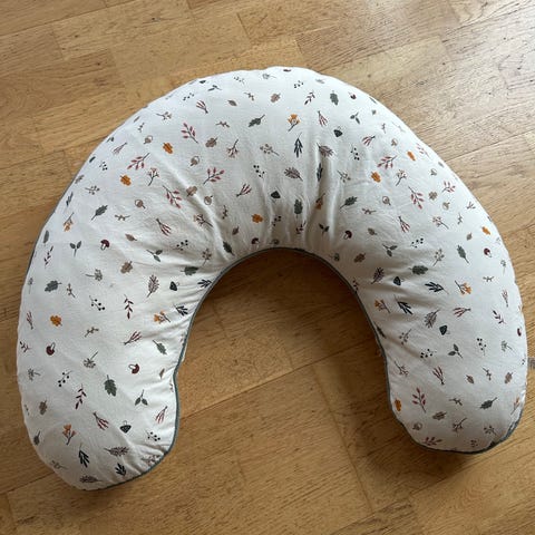 Lite brukt ammepute med 2 trekk, rosa og blått pluss mønster på andre baksiden. Veldig mykt stoff på rosa og blå side. Den er fast så ungen blir holdt oppe. Trekkene og selve puten kan vaskes. Jeg har bare brukt det rosa trekket selv og det er vasket😊