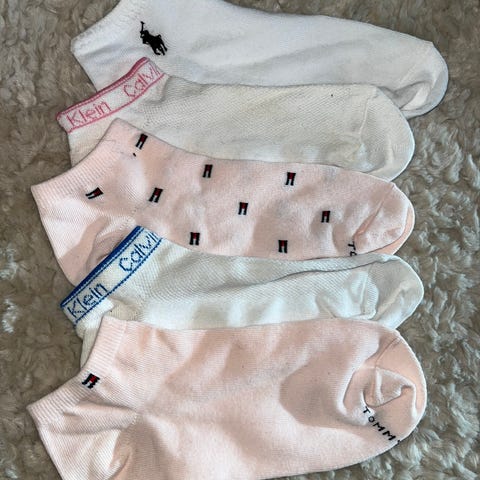 3 par ankelsokker i bringebærrødt, lys rosa og lys grå.