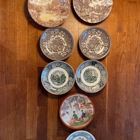 Selges samlet: tolv te/kaffe kopper med fat, tolv tallerkener, ett fat, to lysestaker, en tekanne, en krukke til sukker og en mugge til melk.
