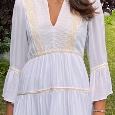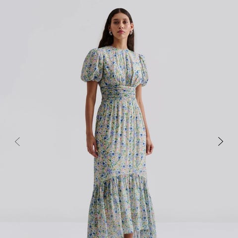 Elegant midikjole fra Hale Bob med et sjarmerende bohemsk mønster, behagelig midilengde og en smigrende, markert midje.