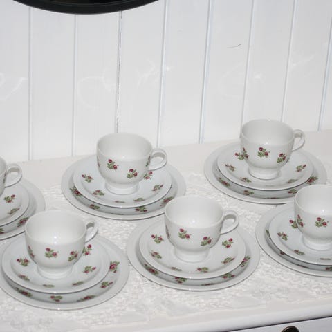 Kaffeservise til åtte personer fra Bareuther Bavaria selges for 550 kroner (kopp: høyde 6,8 cm / diameter 7,2 cm. Skål/asjett: diameter 13 cm / 17 cm. Fløtemugge: høyde 7,5 cm. Kaffekanne: høyde 17 cm. Følger med fire ekstra asjetter). K34. Fraktkostnader: PostNord - 129 kroner. Betaling via vipps.