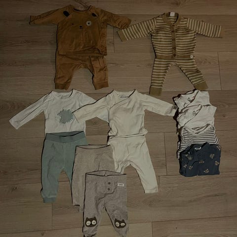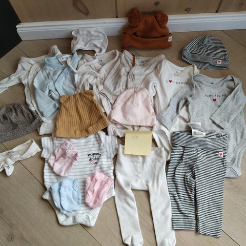14 deler ull pakke i str 56. 50 kr per del, og 150 kr for utedress.