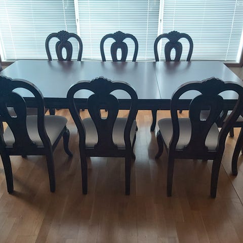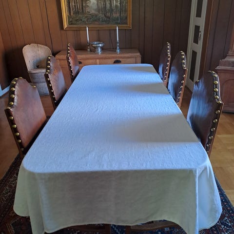 8 stoler følger med, som vi har trukket om setet på. Sjenk følger med.
