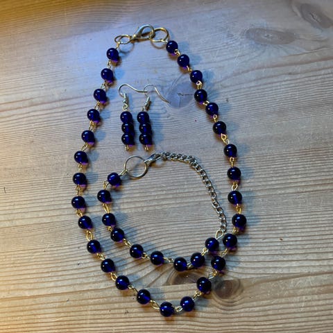 Ferskvannsperler halskjede blåfarget 58 cm. Kr. 200,- Øredobber Kr. 100,-