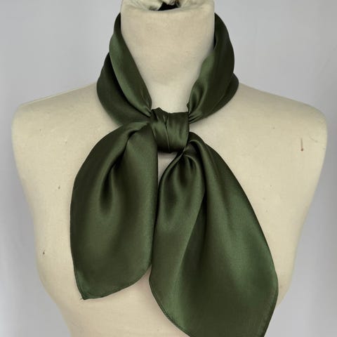 Grønt skjerf i polyester med mål 50x50 cm. Mykt og godt skjerf med silke-finish. Passer til hverdags, fest, bunad og fantasistakk.