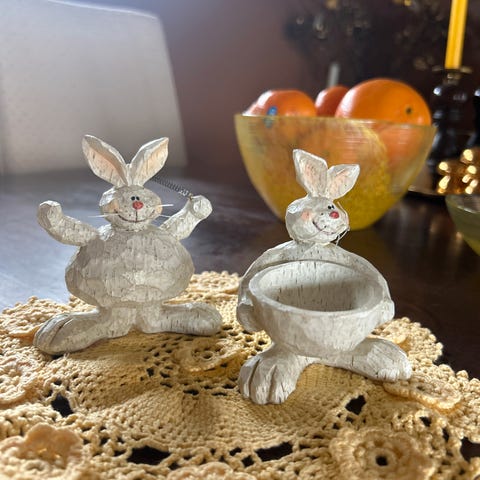 Jeg rydder i påskepynten og selger noen av mine skatter. Stor nydelig påske hare med fin glans. Den er ca. 25 cm. høy og i meget god stand. Ønsker bud over kr. 250,-. Hentes i Tønsberg eller pakkes trygt og sendes for kr. 70,- inkl. sporing og forsikring