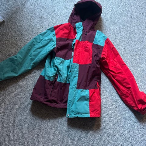 Skijakke, selges. Kjøpt på Urban for 4000,-. Lufting under armer, innerlommer og side lomme. Vanntett 8000 mm. Hette med snøring. Ett lite brennmerke etter grilling nederst på arm, over snølås, se bilde.