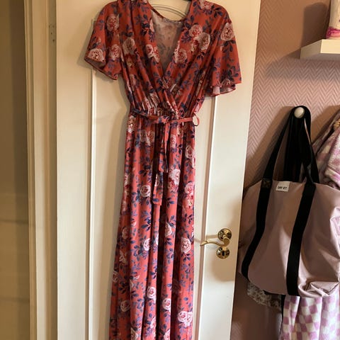 Sommerkjole i flerfarget design, størrelse S. Kjolen har et blomstrete mønster og er ideell for sommerbruk. Passer godt til uformelle anledninger.