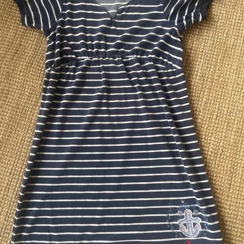 Klassisk kjole med to lommer i mørkeblå, svart og litt hvit. Ingen lapp med stoff (tror det er ullblanding) eller størrelse. Flott struktur på selve stoffet - gjemmer litt ekstra cm her og der.