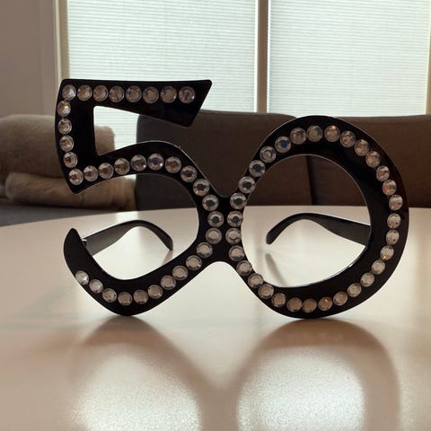Svarte briller som er formet som 30-tall dekorert med glitter.