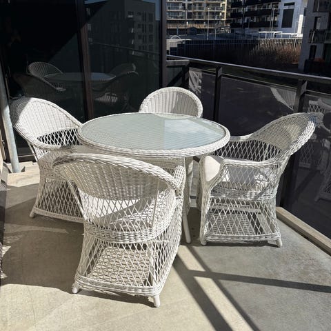 Ny pris! Malte manilla møbler. Litt flassing av maling få steder. Lett å «flekke» over. Kan selges med putene, de er ikke originale, kjøpt på KID i fjor. Bordplaten har en liten skade under på kanten, se bilde. Ingen skarpe kanter ifm denne skaden. Kan fraktes til Oslo ( Drammen/ Oslo) kan møtes på veien el på Røa, Bogstad camping. Tar 200kr i fraktkostnader. Om interesse for putene også blir prisen 1250.