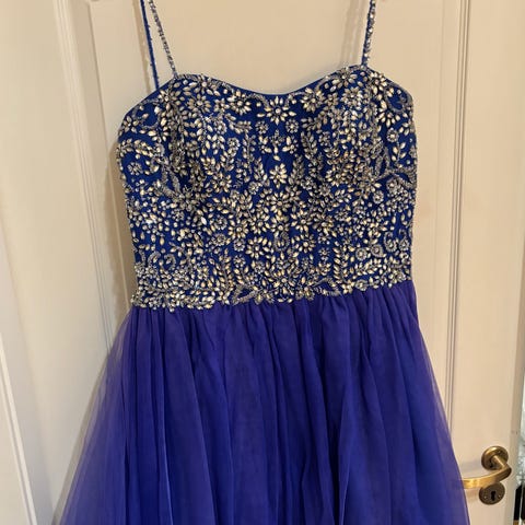 Lang mørkeblå kjole i str. M. Kjolen har en splitt foran. Det er delvis åpen rygg og diamanter bak på ryggen. Brukt 2 ganger.