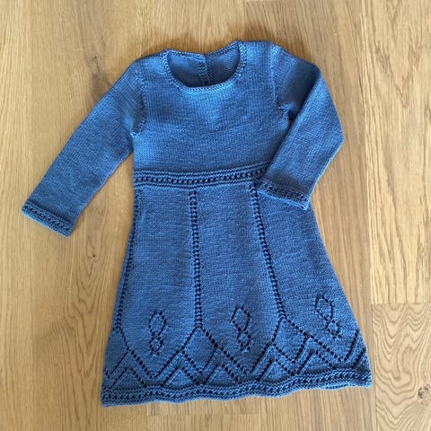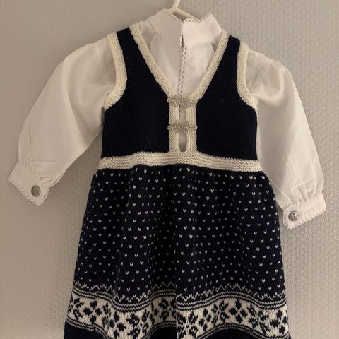 Nydelig hjemmestrikket kjole med mariusmønster. Vi fikk dessverre ikke brukt den før den ble for liten, så kjolen framstår som ny.