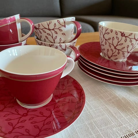 Kopp, skål og 2 asjetter med diameter 17 cm. Retro mønster. Koppen er har en brun kant under og skålen har en sprekk i glasuren (se bilder). Asjettene er i god stand. Ukjent opprinnelse,
