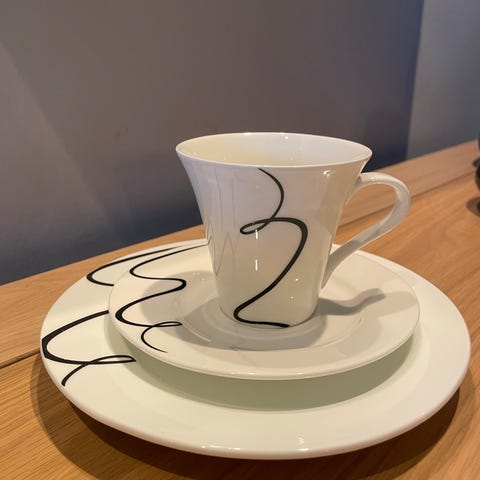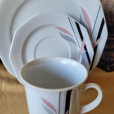 Seks tredelte kuverter med kopp , tefat og asjett selges samlet