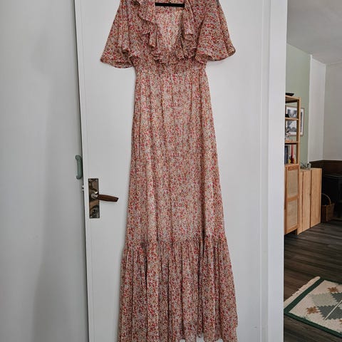 Veldig flott stoff. Puffermer og søte blonde detaljer. Den har hengt på bøyle så er fin i stoffet og i fasongen.
