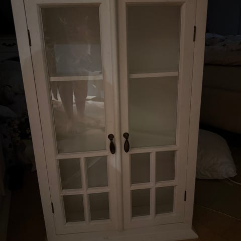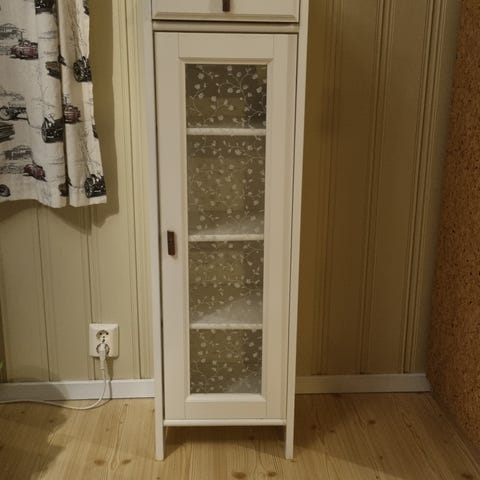 Høyglans veggskap med glasshylle og vanlig hylle i str D26xB50xH99. Selges kr 600,-