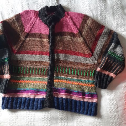 Ny håndlaget strikket cardigan I resten av ullgarn 100% ull. Vaskes på ull program med Milo. Se på bildene størrelse.