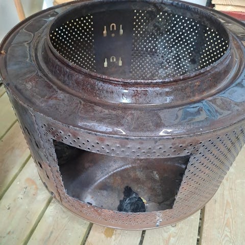 Kuleformet bålpanne i metall i svart farge. Bålpannen står på tre ben og har en halvkuleformet topp med netting som kan åpnes for enkel tilgang til bålet. Nettingen rundt gir beskyttelse mot gnister. Egnet til bruk utendørs i hage eller på terrasse som varmekilde og for bålbrenning. Ingen merke- eller modell informasjon er oppgitt. 73 cm innvendig mål. Er ikke brukt, men har stått ute i vinter.