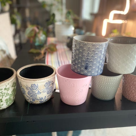To matchende potter i forskjellige størrelser. Den ene er 17cm høy og 17cm i diameter og den andre er 15x15cm. Ønsker å selge de samlet.