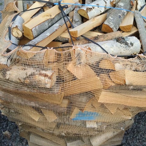 Har et parti med blandingsved pakket i 60 liter sekk.