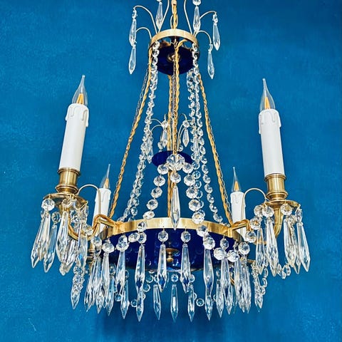 Antikk lysekrone i krystall. Murano? Denne er meget gammel og har sine feil og mangler, men er allikevel i god stand. Mulig det er noe sølv på den.