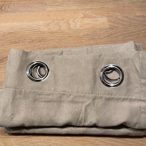Gardinene er festet på skinne med borelås. Skinne med komplett oppheng medfølger. Kommer fra et røyk- og dyrefritt hjem.