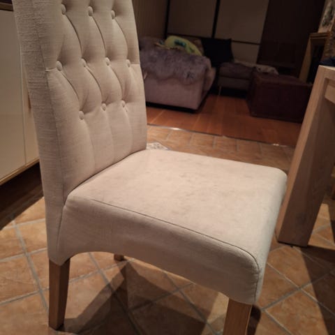 Fra Jysk. Fine gode hvite ute stoler- også vært brukt inne noen sesonger som spisestue stoler. fine, nyvasket og beina er nylig pusset og lakket - stødig og behagelig å sitte i .