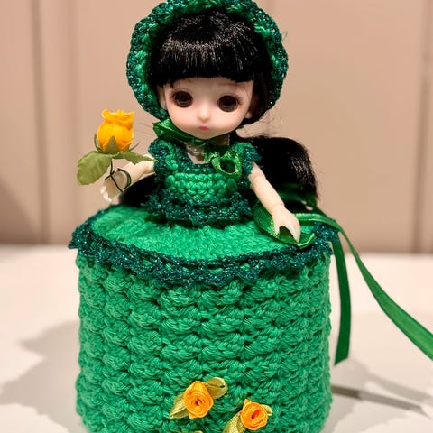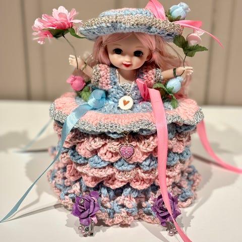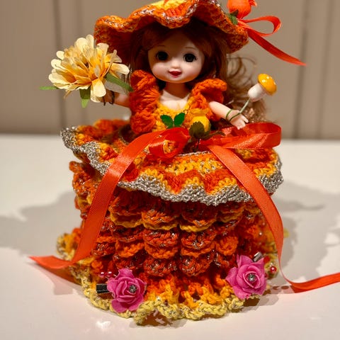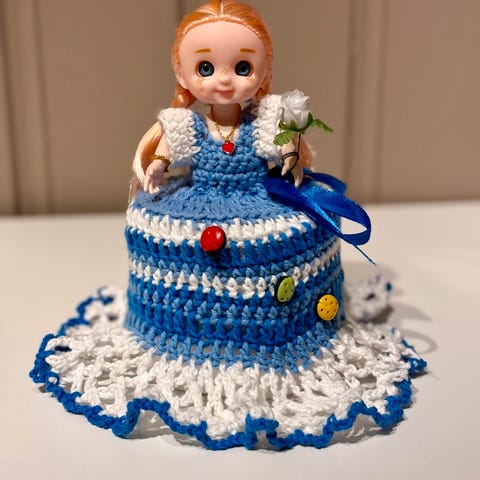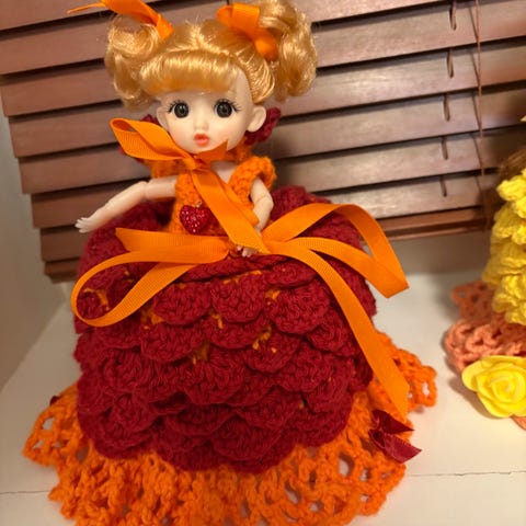Søkeord: Håndlaget Retro Gammeldags Heklet Hekling Dukke Dokke Dorull Toalett Bad Pynt Håndarbeid Fargerikt Hjemmelaget Kjole Gaver Pride