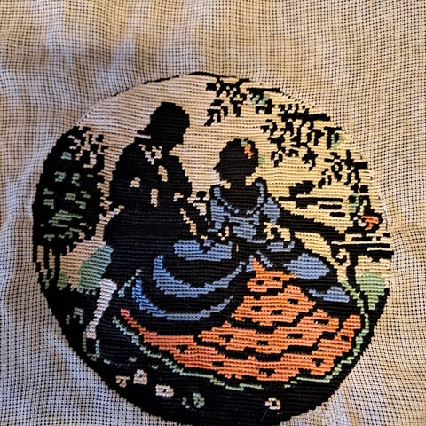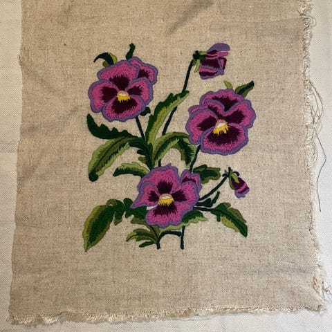 Søkeord: broderi, brodert, klokkestreng, åkle, klostersøm, korssting, teppe, billedvev, veggteppe, ull, redesign, retro, rustikk, vevnad, gobelin, tekstil, smijernsbeslag, tradisjon, håndlaget, hjemmelaget, husflid, tekstilkunst,