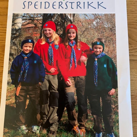 Oppskriftsfolder med oppskrift på Kvitfjell genser, strømper, pannebånd og lue. Voksen og barn. Fakkelmannen.
