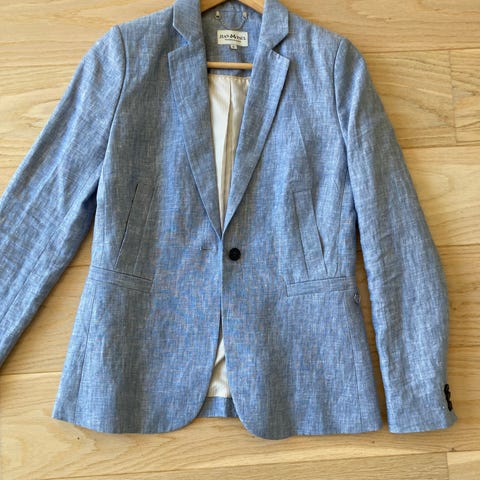 Jakka ser ut som lin og krøller litt som lin men er ikke lin;-) Jeg klippet av vaskelappen så vet ikke helt hvilket stoff det er men tror et blandingsstoff med bomull. Er lite brukt og fin i stoffet men er krøllet i armer og rygg etter bruk. Jakken er kjøpt på Promod i Berlin. Passer en str. 38/40.