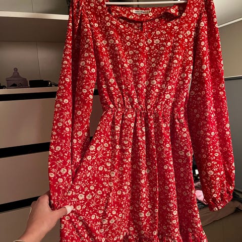 Rød blomstrete kjole i størrelse XS. Kjolen har vide ermer og en dyp utringning. Passer godt til både hverdagsbruk og spesielle anledninger.