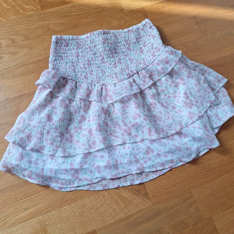 Rosa skjørt med bladmønster fra GAP. Små lommer foran. Lukkes med glidelås. Kan strammes in. På innsiden med strikk i livet