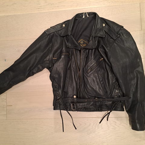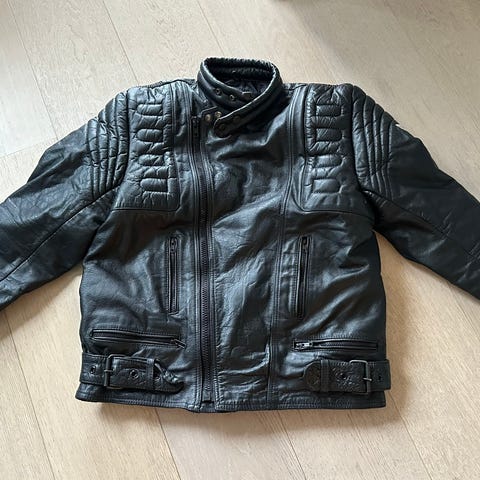 Jakken har to lummer, og hette som kan taes av. Trykknapper.