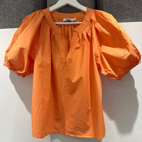 Orange bluse m kort erm, str m, knapp i nakken til å hekte fast.. svært lite brukt. Hentes I olsvik eller sendes mot porto..