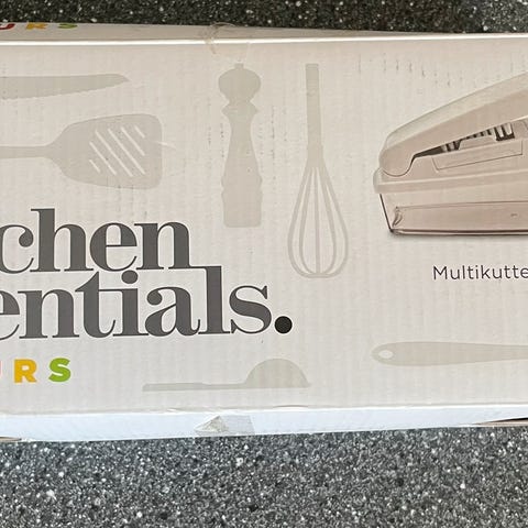 Multikutter som kan brukes til å lage pommes frites, salat med tre forskjellige kniver. Er glass bolle med lokk som du har under.